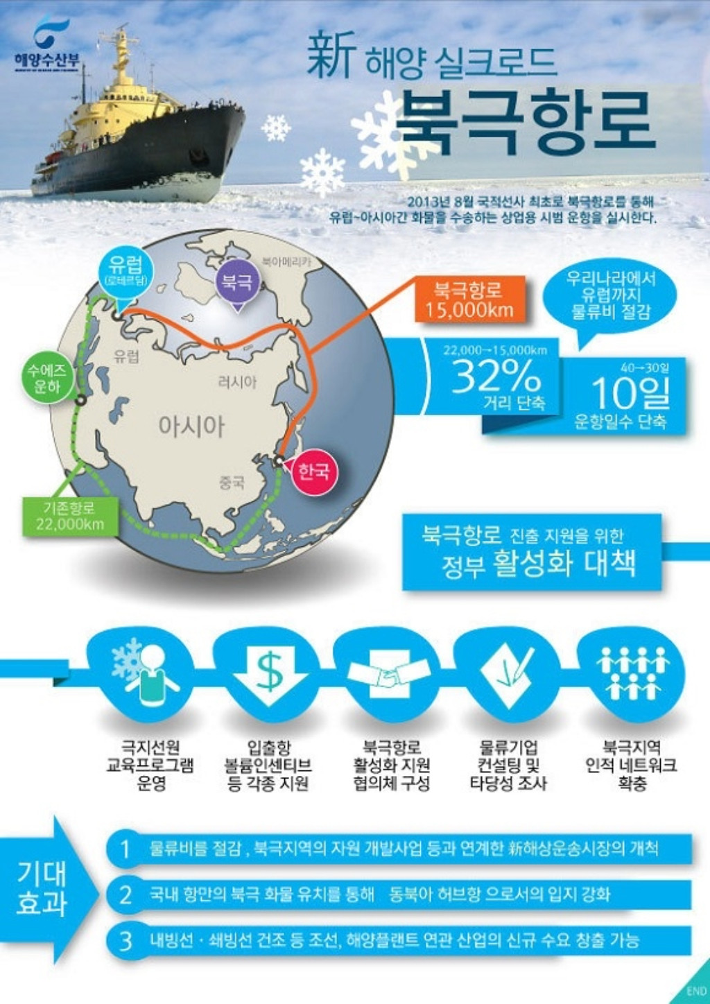 한국도 중요한 플레이어로 새로운 개척에 뛰어들고자 합니다. 우리나라는 꽤 절묘한 곳에 자리 잡고 있습니다. 북쪽으로는 유라시아 대륙이 펼쳐져 있습니다. 현재로서는 막다른 골목입니다. 동쪽으로는 태평양, 남쪽으로는 동남아시아와 일본, 오세아니아까지 펼쳐져 있습니다. 바닷길로 세계와 연결되어 있는 셈입니다. 그러니 바닷길이 넓어지면 운신의 폭이 넓어집니다. 하지만 우리가 북극을 주목하는 이유는 좀 더 구체적입니다.